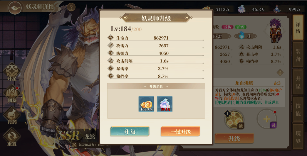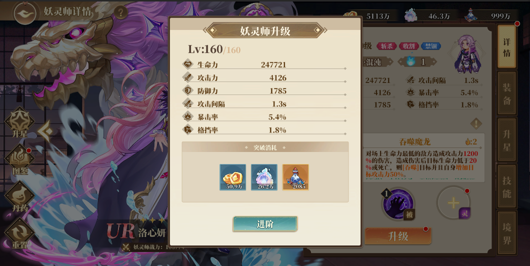 妖靈師可以通過消耗升級(jí)材料(妖晶幣、龍?jiān)`液)提升等級(jí),而升級(jí)可以提升面板屬性,當(dāng)達(dá)到等級(jí)上限時(shí)可以通過消耗妖晶幣、龍?jiān)`液和九轉(zhuǎn)丹進(jìn)階等級(jí)上限。不過前期資源有限,還是盡量避免將養(yǎng)成材料分散給太多角色,練好一隊(duì)主力隊(duì)伍能過主線才是最重要的。?