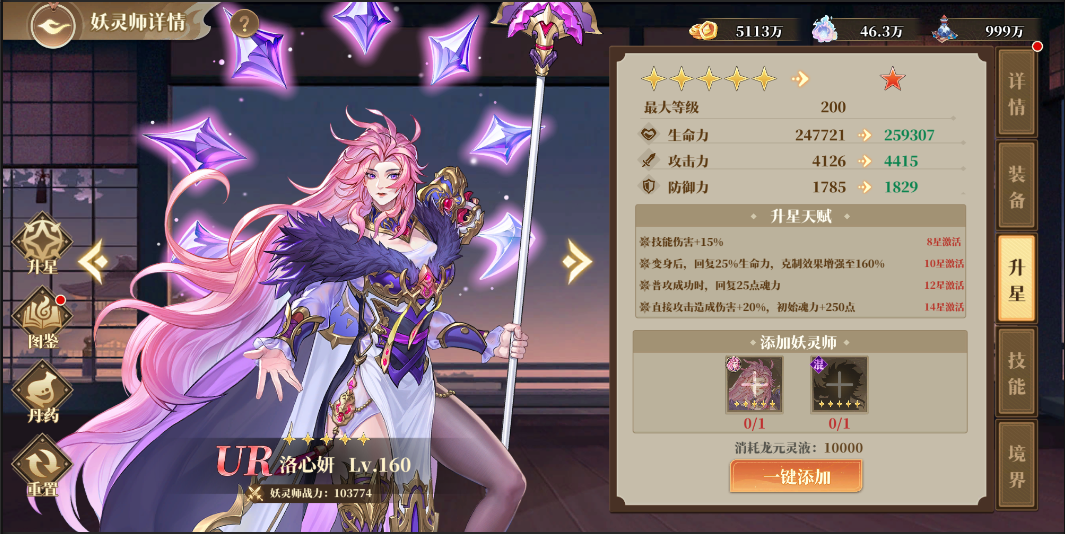 升星可以提高英雄的各項(xiàng)初始屬性,每次升星需要消耗不同條件升星材料,升星達(dá)到指定星級(jí)后還可額外解鎖該妖靈師獨(dú)有的升星天賦。已經(jīng)滿星或溢出的妖靈師可通過招募——遣散功能進(jìn)行遣散,再用獲得的時(shí)空殘卷到秘寶軒的兌換商店中兌換自己所需要的妖靈師。