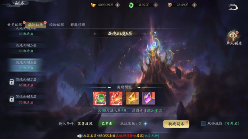 5、混沌幻境:每日有兩次挑戰(zhàn)機會和四次靈玉購買機會,殺怪越多獎勵越豐富。