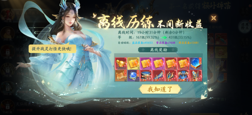 6、離線歷練:離線期間會不斷存儲經(jīng)驗和道具待玩家上線領取,需要使用歷練符咒來增加掛機時間。
