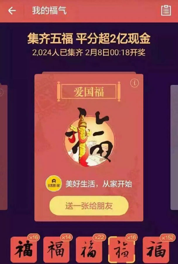 事情是這樣的,通俗的講就是支付寶今年干倒了騰訊爭(zhēng)取到了春晚直播發(fā)紅包的機(jī)會(huì),于是突然在支付寶手機(jī)客戶端推出了一項(xiàng)“集?!被顒?dòng),只要收集齊了5個(gè)福字就可以分到2.15億紅包中的一部分,具體能分到多少就不得而知了。而這個(gè)活動(dòng)只需“從即刻開始加10個(gè)支付寶好友”便可立即獲得3個(gè)福字。因此導(dǎo)致你們的支付寶好友申請(qǐng)這幾天“炸了”...