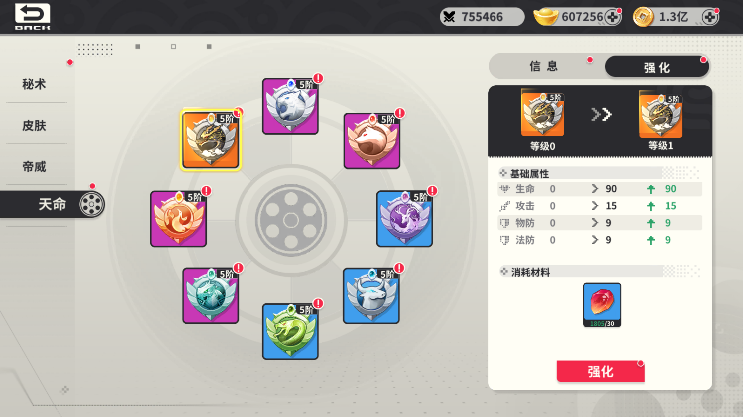 玩家可以通過(guò)打造材料獲得對(duì)應(yīng)天命,同時(shí)可以裝備天命來(lái)提升數(shù)值。天命采用換代形式,不同等級(jí)裝備的天命階數(shù)是不一樣的。同時(shí)天命可以進(jìn)行強(qiáng)化和突破,提升天命屬性。